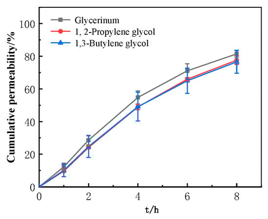 In the makeup water, we explored the influence of different polyols on its penetration, and selected glycerol (S-NA-P1), 1,3-propanediol (S-NA-P2), and 1,3-butanediol (S-NA-P3) as the objects of investigation. The results are shown in Figure 7. The results showed that the cumulative permeability was 81.48%, 77.64%, and 76.59% at 8 h, respectively, indicating that the penetration effect of glycerol was better. Using One-way ANOVA comparative analysis, there was no significant difference in the cumulative permeability between the three (p > 0.05).