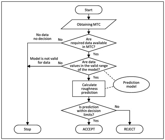This section describes a procedure for making decisions about the acceptance or rejection of a steel supplier or supply using a roughness prediction model. The decision-making flow chart is shown in Figure 1. The decision is based on data from the MTC that must be available from potential steel suppliers. Not all MTCs contain all the required data (see Section 5.2). The next step is to check whether the input data are within the valid range of the model. A decision can then be made to accept or reject a particular batch of steel from the supplier.