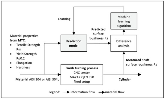 The motivation for the research was the request of an organization producing precision components for the food industry from AISI 304 and AISI 304L stainless steel to ensure that surface roughness after finishing turning is within the specification limit. The surface roughness can be affected by various factors, including the material properties, machining process, and machine setup [8]. The variability of the properties of the input material was identified as the reason for non-compliance with quality. Compensating material variability by changing the machine setup for each new steel supply is impossible because production is single piece or small batch, which takes a long time. Therefore, there was a requirement to determine the decision-making process when choosing a supplier or a specific batch of material that will ensure the required quality of finishing turning in advance. Predicting surface roughness quality using an appropriate model can be the answer.