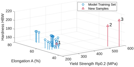 Figure 3 shows the space of input variables of the model, where the value of Yield Strength Rp0.2 is on the x-axis, the Elongation value is on the y-axis, and the Hardness value is on the z-axis. The figure shows the training set of samples (Model Training Set) from [38] and the set of new samples (New Samples). It is clear from the figure that the input variable space of new samples 2 and 3 is far from the training set of samples. The value of the Yield Strength of the new samples is twice, and the value of Elongation is half that of the samples from the training set. With the new sample 1, there will probably be another reason why the models are unable to predict the roughness. Upon further investigation, it was found that sample 1 was produced with machine setup values for the feed rate and the depth of cut different from the training set.