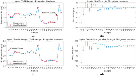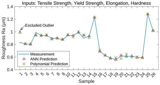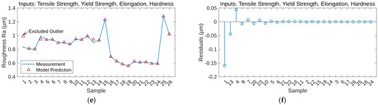Table 3 contains model performance expressed as R2, MAE, MaAE, and RMSE values for four polynomial models and two ANN models. Models 1, 3, and 5 were trained with all samples. Then, the sample with a maximum value of residual was excluded from the training set for models 2, 4, and 6. Figure 4 shows Roughness measurement, prediction and residuals for polynomial models 2 and 4 and ANN model number 6.