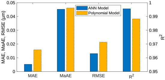 A graphical comparison of the ANN and the polynomial model is shown in Figure 6. The ANN model is significantly better in the mean absolute error (MAE) and root mean square error (RMSE) values. The maximum absolute error (MaAE) of the ANN model and the polynomial model is almost the same, but the ANN model is slightly better.