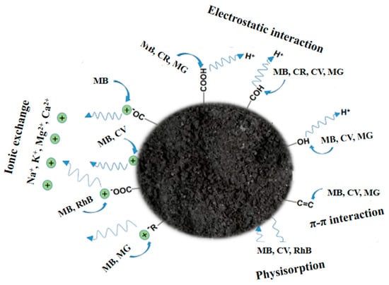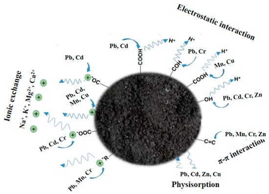 In general, based on the knowledge from numerous previous studies, it can be concluded that the mechanisms responsible for the removal of pollutants from aqueous solutions using hydrochars include the ion exchange mechanism, hydrogen bonding, surface complexation, strong π–π interaction, and electrostatic interaction. Figure 4 shows the aforementioned interactions.