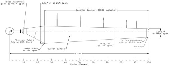 The optimization is based on the NREL Phase VI geometry, which was created for applied CFD validation tests, with the two-bladed 10.058 m diameter NREL Phase VI Rotor based on the S809 airfoil []. Figure 1 illustrates the baseline geometry of the airfoil, which is replotted based on Hand et al. [].