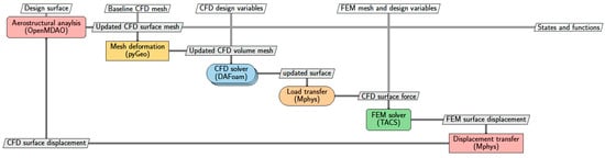 Using OpenMDAO and MPhys, the aerostructural system was created in a modular manner for adaptability. The components in Figure 1 needed to multiply the state Jacobian matrix by a particular vector and implement ways to compute output based on input. The adjoint total derivative computation was unified with OpenMADO using the MAUD algorithm []. In OpenMDAO, a linear block Gauss–Seidel solver with Aitken relaxation was employed to solve the coupled adjoint of CFD and FEM.