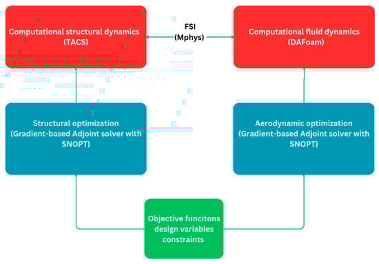 In spite of having a higher computational cost and implementation effort when compared to low-fidelity solvers, the use of high-fidelity solvers in aerostructural design optimization of wind turbine blades can provide improved accuracy and more complete model specification. To manage the high-dimensional and high-fidelity optimization formulations in a tractable numerical problem, gradient-based optimization techniques are required, such as the use of adjoint-based derivative computations. Multiple aerostructural, hydrostructural, aerothermal, aeropropulsive, and aeroelastic MDO issues have been incorporated in the OpenMDAO framework to handle interdisciplinary design optimization challenges in engineering systems []. The main functionality of the Python-based, open-source, high-performance computing platform known as OpenMDAO is gradient-based optimization using analytic derivatives. The implementation presented in this paper is based on a two-way fluid–structure interaction (FSI) in the OpenMDAO framework that couples the discrete adjoint with OpenFOAM for high-fidelity multidisciplinary design optimization (DAFoam) [] and the Toolkit for the analysis of composite structures (TACS) [] with Mphysics []. With competitive speed, scalability, and accuracy, DAFoam employs a discrete adjoint technique without Jacobians. It also offers a Python interface for linking interdisciplinary design optimization.