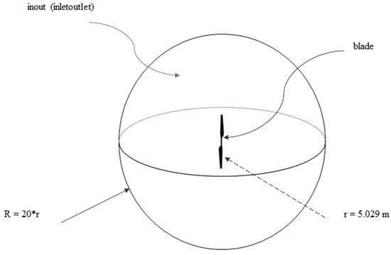 In our study, the computational domain is a spherical shape with the blade located at the center of the spherical far-field domain, as shown in Figure 4, where the radius of the blade is 5.029 m while the radius of the spherical domain is 20 times the blade’s radius, and the entire spherical domain is defined as inlet–outlet.
