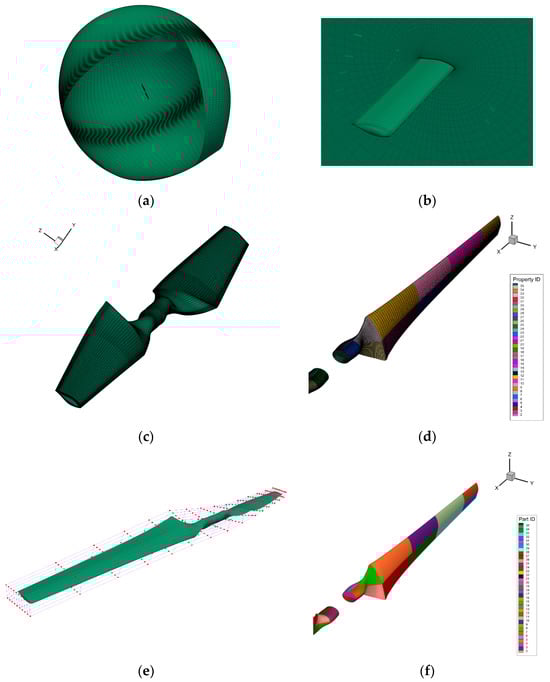 As in our earlier research [], we used the NREL Phase VI, which has just two blades, as the baseline geometry in this investigation. Regarding the aerodynamic component, the surface mesh as shown in Figure 5c is constructed in ICEM CFD, and the spherical volume mesh as shown in Figure 5a is created by extruding the structured surface mesh using the opensource mesh generator pyHyp []. Figure 5b depicts the hyperbolic expansion layer that surrounds the wind turbine blade. Additionally, MSC Patran generates a structural finite element mesh that matches the shape of the outer mold line and incorporates an interior main shear web as seen in Figure 5d. The whole collection of structural elements is made up of thin CQUAD hexahedral shell elements. At the root, which is situated at a distance of about 0.66 from the rotating axis, two identical blades are fastened. In Figure 5e, the FFD points for the aerodynamic optimization are presented, and the aerodynamic form optimization is put into practice. In contrast, Figure 5f shows the structural design factors as a total of 60 panels with random colors.