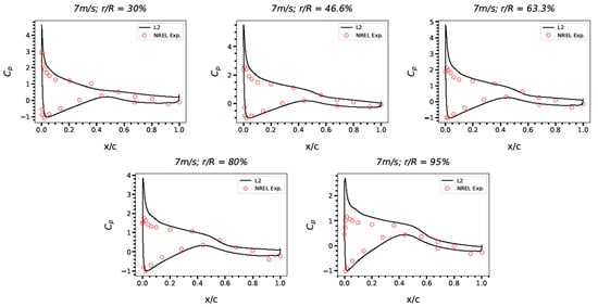 Comparison of the pressure coefficients (Cp) from level 2 mesh and NREL experimental data.