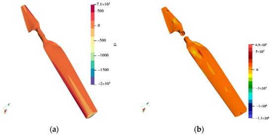 (a) Pressure on the blade on the aerodynamic side (Pa); (b) stress on the structural side (Pa).