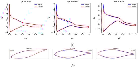 (a) Cp comparisons before and after the optimization in terms of 30%, 63%, and 95% spanwise section; (b) shape changes in the cross-section profiles accordingly.