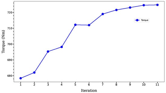 According to Figure 9 the torque was increased by around 6.78 percent as the main goal of the aerodynamic portion of the aerostructural optimization. The torque production of the wind turbine blade increased by around 6.78 percent as a result of this optimization procedure. The optimization of the blade’s form is responsible for the increase in torque. By improving this aspect, the airflow around the blade can be better managed, which improves the efficiency with which wind energy is transferred to the turbine blades.