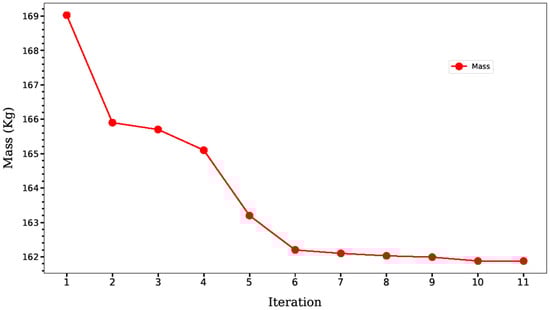 The mass of the blade is continuously measured and recorded throughout the optimization process. The findings are shown in Figure 10, which indicates that with each optimization step, the mass of the blade reduces. After the sixth iteration, the rate of decline slows down, indicating that future tweaks would not result in substantial mass reductions. The mass of the blade also decreased by 4.22 percent as a consequence of the optimization process, which has the potential to significantly increase the turbine’s performance and efficiency.