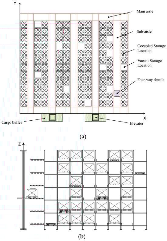 In the field of the warehouse and logistics, “technology, intelligent transformation and flexible leap” have recently emerged as the primary development trend. The old extensive-management model has not been able to fulfill the demands of the precise management of warehouse cargo due to the fast development of company size, the increasing kinds of materials, and the complicated business process. As a result, the transformation of the cargo-storage system into a three-dimensional, automated, and intelligent method is unavoidable. A cutting-edge automated warehousing system called the four-way-shuttle-based storage and retrieval system (FWSBS/RS) is currently available on the market. Vertical elevators, horizontal four-way shuttles, three-dimensional shelves, together with additional hardware, and control management software, make up the system []. The benefits of this storage system are its high storage density, adaptable operating pattern, and quick reaction time. Since it has successfully solved the issues caused by traditional automated storage equipment’s large area occupation, high energy consumption, low efficiency, and weak robustness [], manufacturing companies and internet e-commerce companies have started to prioritize FWSBS/RS.