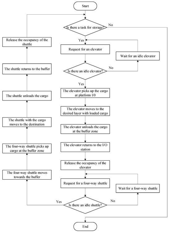 Inbound and outbound are the two primary operational modes in FWSBS/RS. During inbound operations, the system’s elevator runs vertically to move the chosen cargo to the desired layer and the cargo can be delivered to the desired destination using a four-way shuttle, which can travel in four directions: forward, backward, left, and right. The system optimizes the storage position of cargo based on the actual situation during inbound operations, following a fixed procedure. In contrast, during outbound operations, the process is reversed, with a more randomized sequence and batch selection, prioritizing tasks differently. This paper primarily addresses inbound jobs’ scheduling, specifically focusing on the characteristics of randomly arriving cargo. For the parallel operation of both elevators and shuttles, lack of an efficient scheduling mechanism would result in poor equipment utilization, an increasingly high energy consumption, and a long operating time, which runs counter to the idea of intelligent and low-carbon development [].