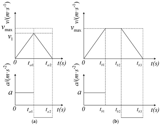 The main equipment in FWSBS/RS are four-way shuttles and elevators, which accelerate and decelerate during the stationary-to-stop operation. In practical operational scenarios, their operational processes are regarded as a combination of uniformly accelerated, decelerated motion, and constant linear motion []. To minimize collisions while maximizing equipment efficiency, it is essential to impose reasonable acceleration and deceleration constraints, considering adequate acceleration and deceleration distances within the limited travel range of the equipment. The motion process can be divided into two patterns: (a) stationary–uniform, acceleration–uniform, deceleration–stationary; (b) stationary–uniform, acceleration–uniform, motion with maximum speed–uniform, deceleration–stationary. Figure 3 depicts the two patterns.