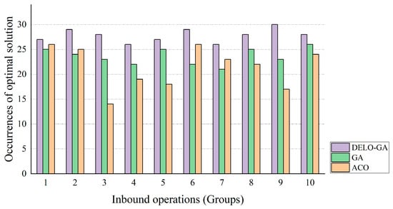 For larger scale instances, including 20 or more inbound-operation jobs [], the exact solution cannot be found using the enumeration method. Three algorithms, ACO, GA, and DELO-GA, are used to solve each group of inbound operation with the number of jobs of being 20, 40, 60, 80, and 100, respectively, and each group of jobs is solved using the three algorithms for 30 times. The three algorithms are programmed in Python, and are run and tested on a Windows 11 computer configured with Intel(R) Core(TM) i9-9900K CPU @3.60GHz and 32 GB RAM.