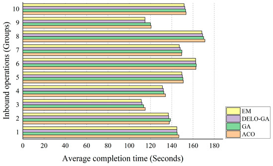 Table 8 shows the completion times for batch inbound jobs obtained by running three algorithms. The optimal-job-completion times are 210.83 s, 411.31 s, 613.83 s, 811.31 s, and 1013.83 s for five different scales, respectively. When comparing the results produced by the ACO and the conventional GA, the suggested DELO-GA algorithm’s average optimization efficiency is 2.28% and 2.11%, respectively.