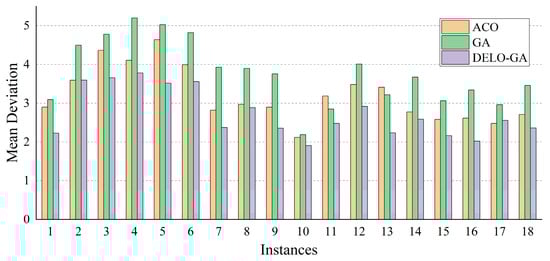 From Table 7 and Figure 7, it is evident that the DELO-GA algorithm proposed in this paper consistently maintains a mean deviation of less than 4 across 30 independent tests while solving inbound operations for 18 layouts of the FWSBS/RS. Notably, for the 10th layout, all three algorithms produced minimal and closely aligned results. Therefore, further comparative analyses of increased batch quantities for inbound jobs are conducted in Section 6.3, focusing on Instance 10 (M = 6, T = 5, P = 12).