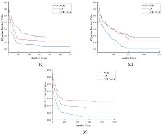 Due to the fact that 10 instances are small-scale instances, an exhaustive enumeration method is employed to find the optimal solution for each group of jobs. As shown in Table 4, comparing the results of the enumeration method, ACO, GA, and the DELO-GA algorithm proposed in this paper, we observe that ACO and GA match the enumeration method in 9 sets but struggle to find the optimal solution in the 9th instance, being trapped in low efficiency and the local optimum. In contrast, the DELO-GA algorithm consistently discovers the optimal solution for all 10 instances.