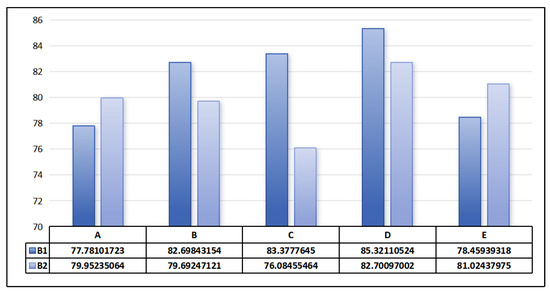 Figure 1 gives a clear message that the response and service capabilities of the emergency response systems for water hazard accidents in the five coal mines all exceed 75. Among them, the response and service capabilities of the emergency response system for water hazard accidents in the D Coal Mine are evaluated as “good”. It is also the only mine among the five coal mines whose B1 and B2 scores reach 80 or above. Hence, other coal mines are highly recommended in order to learn from their construction experience, identify, and fill in gaps, in the hope of improving the effectiveness of the emergency response system. In addition, it is also revealed that the service capacity B2 score of the C Coal Mine is relatively weak, which means obvious weak links exist in one or more dimensions, such as emergency management, staff allocation, and prevention preparation. For the A Coal Mine, its response capability B1 score is relatively poor, which is reflected in one or more aspects of accident information transmission, emergency command and control, and emergency rescue and mitigation.