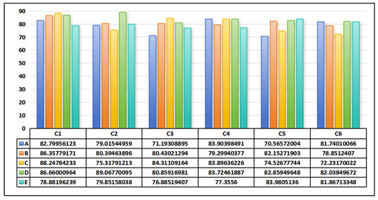 Based on the data shown in Figure 2, it is apparent that the six indexes at the sub-criterion level of the emergency response systems for water hazard accidents in the five coal mines are all rated above 75. Among them, the average scores of C1~C6 are 84.59, 80.73, 78.74, 81.64, 78.82, and 79.35, respectively, all of which are greater than 75. However, it is noteworthy that the average scores of C3, C5, and C6 are less than 80, indicating that the development of the emergency response system for coal mine water hazard accidents lags behind on emergency rescue and mitigation, personnel team, as well as prevention and preparation. It is urgent for each coal mine to identify deficiencies and accelerate construction.