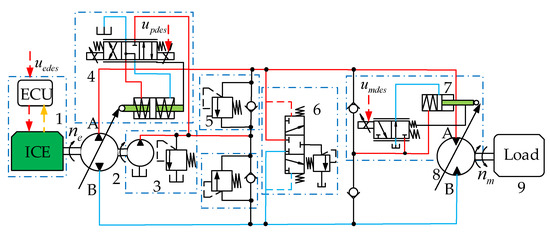 Schematic structure of the HSDP. 1. Internal combustion engine (ICE). 2. Pump. 3. Charging system. 4. Pump displacement control unit (PDCU). 5. Safety valves. 6. Flushing valves. 7. Motor displacement control unit (MDCU). 8. Motor. 9. Load.