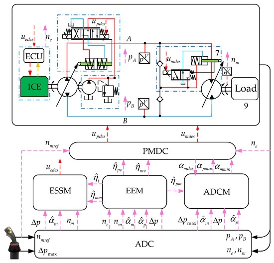 Figure 2 shows the schematic structure of the adaptive controller (ADC). The ADC is composed of an engine speed set module (ESSM), an efficiency estimation module (EEM), a displacement control module (PMDC), and an adaptive control module (ADCM). The ADC receives more than just the motor reference input from the handle: it also receives system feedback signals, such as the pressure signals , the engine speed signal , and the motor speed signal . The ESSM calculates the required power of the powertrain based on , , and and determines the desired speed control signal according to the required power. The EEM provides the estimated system efficiency in real time based on the pump/motor loss models and the system feedback signals. The PMDC sets the pump and motor displacement control signals based on and . The ADCM limits the control signals of the pump and the motor based on the preset pressure difference and the engine maximum torque to prevent engine overload stall and high system pressure.