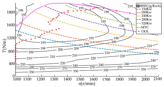 Brake-specific fuel consumption (BSFC) is a measuring index of engine fuel economy; the lower the value, the better the fuel economy. Figure 3 shows the universal characteristic curve of a certain engine; it can be seen that the BSFC is different under different speeds and different loads, and its minimum value is reached when the load torque is close to the maximum torque at the current speed. Therefore, for each engine speed , there is an engine power level with minimum BSFC. Then, the engine optimal operating curve (OOL) can be created by connecting these points , as shown in Figure 3. Using the polynomial fitting method, the relationship between and is expressed as follows:
