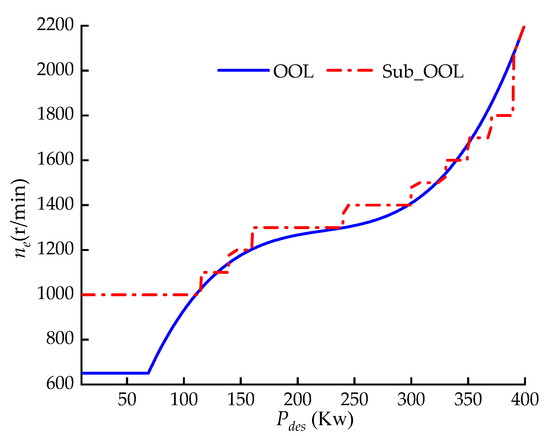 Taking the minimum speed requirement of the pump and other systems into consideration while avoiding the frequent speed adjustment of the engine, we designed a sub-optimal engine operating curve (Sub-OOL) based on segmented speed control, as shown in Figure 4.
