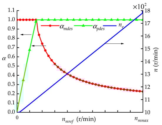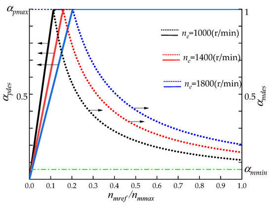 Herein, are the upper limit of the pump displacement ratio and the lower limit of the motor displacement ratio, respectively, which are to be determined via the ADCM in the next section. To be specific, Figure 5 shows the control law of and under different and .