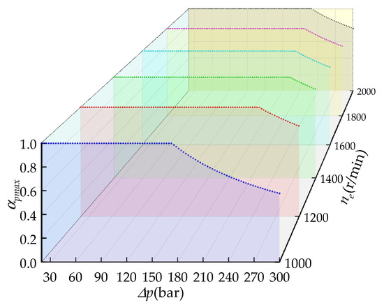 To maintain the engine torque so it does not exceed its available under a certain speed, based on Equations (30) and (31), the real-time of the pump can be calculated by Equation (32). Figure 6 shows the variation of with pressure difference and engine speed .