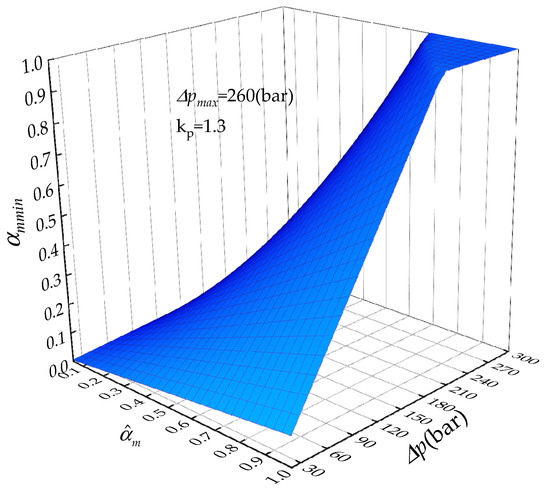The predefined maximum pressure difference and the control gain are introduced to limit the system maximum pressure according to Equation (8), and the real-time of the motor can be calculated by Equation (33). Figure 7 shows the variation of with pressure difference and the desired motor displacement ratio :