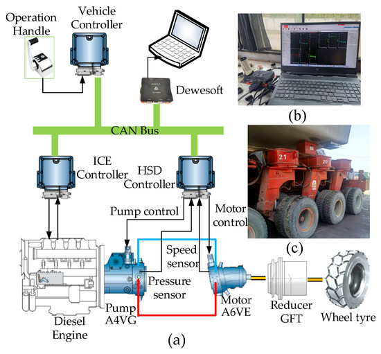 Experimental field tests based on one THY900 heavy transport vehicle from a company were carried out to verify the effectiveness of the proposed controller. The vehicle used a closed hydrostatic powertrain (HSDP) as its travel drive system. A schematic of the HSDP system of the vehicle is shown in Figure 8a, and Figure 8c shows a photograph of the test vehicle. The HSDP system employs a driving mode in which parallel multipumps drive parallel mutimotors and the control system employs a distributed integrated control structure based on CANbus. Moreover, Dewesoft software was used to collect and record the system control and status signals. Table 1 shows basic information on the heavy transportation vehicle, and Table 2 shows the basic parameters of the main components of the vehicle’s HSDP system.