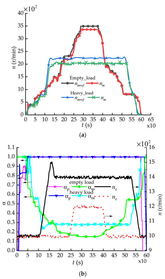 For spatial reasons, this paper only shows the system running states and control information in the process of the vehicle accelerating from zero to its allowable maximum speed under flat slope conditions with a heavy load and an empty load. Figure 10a shows the variation in the motor speed and the reference input . The motor speed can closely track the variation in and maintain good tracking accuracy. Figure 10b shows the variation process of the parameters, , , and , and it can be seen that the three variables change cooperatively in accordance with the rules set by the ADC, thus ensuring the tracking accuracy of to .