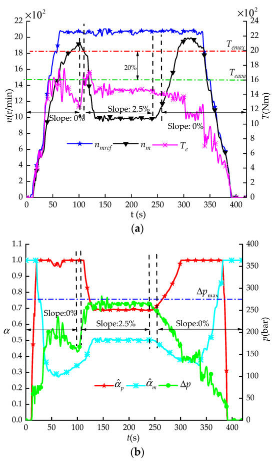 In view of the actual testing conditions for the vehicle, testing conditions of a heavy load and 2.5% slope were chosen to test the adaptability of the HSDP system. Moreover, to make the results more intuitive, the system reference input was always kept at its maximum value while the vehicle was climbing the slope. Figure 11a shows the variation in , , and , and Figure 11b shows the variation in , and during the process of vehicle climbing.