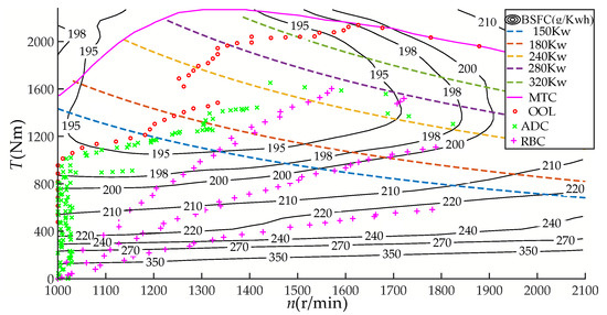 Additionally, the results of the comparison tests under other conditions are presented in the form of a scatter plot of the engine operating points in Figure 12.
