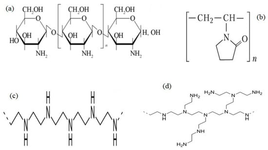 Polymers used in our research as a stabilizer of nanoparticles: (a)—chitosan, (b)—polyvinylpyrrolidone (PVP); (c,d)—polyethyleneimine (PEI).