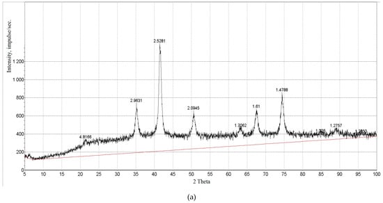 The X-ray diffraction pattern of the synthesized Fe3O4 (Figure 2a) proves the crystal structure of magnetite, and the peaks in the diffraction pattern at 35°/43°/57°/63°/74° correspond to the lattice planes (311), (400), (422), (511), and (440) characteristic of Fe3O4. The diffraction pattern of CoFe2O4 (a) shows diffraction peaks of iron oxide and cobalt (2θ = 50 ÷ 55°) and a weakly distinguishable region in the region 2θ = 40 ÷ 45°. The resulting spectrum of the nanoparticle powder was compared with the database spectra. The location of the peaks and the ratio of their intensities in the diffraction pattern confirm the formation of a pure magnetite Fe3O4 phase. Based on the shape of the peaks (narrow distribution and good intensity), it can be argued that the resulting nanoparticles have a high crystallinity.