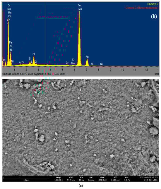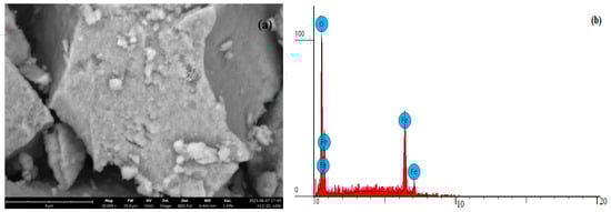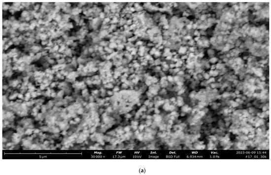 According to elemental analysis (Figure 2b), the content of elements (in %) in the synthesized magnetite was as follows: O (26.51), Al (0.15), Si (0.13), S (1.13), Cl (1.27), Cr (0.47) Mn (0.40), Fe (69.94). The results of the SEM analysis of the synthesized magnetic composite Fe3O4 show that the nanoparticles prepared by the co-precipitation method have granular inhomogeneity (Figure 2c,d).