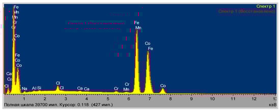 The content of elements in CoFe2O4 (%) according to elemental analysis (Figure 4) were as follows: O (21.16), Al (0.17), Si (0.12), Cl (14.68), Ca (0.03), Cr (0, 19), Mn (0.22), Fe (43.28), Co (20.15).