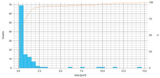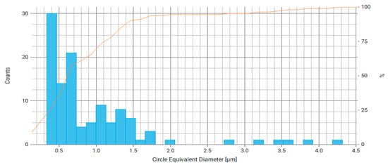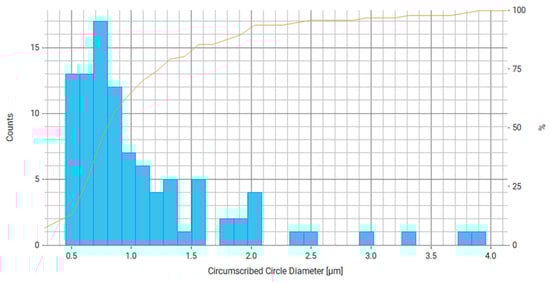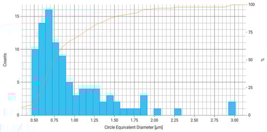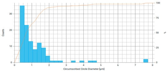 Histogram of equivalent circle diameter distribution for measured particles, where the right axis is the number of particles and the orange line is the cumulative percentage curve.
