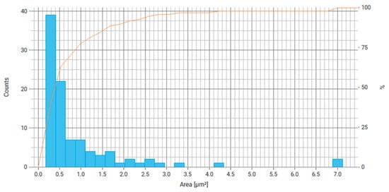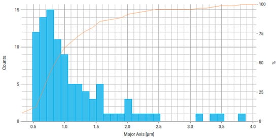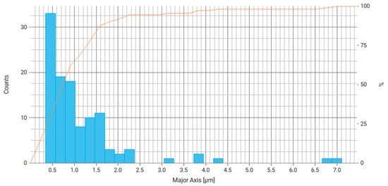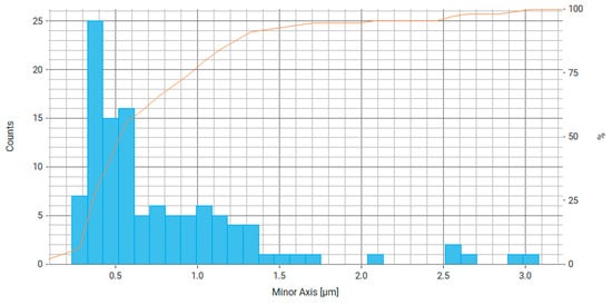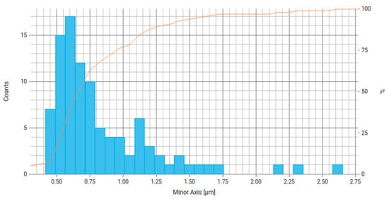 From the data obtained (Figure 7 and Figure 8), it can be stated that about 60% of the particles have a major axis value (largest chord, diameter) in the range of 0.5–1 µm and about 60% of particles have a minor axis size (smallest chord, diameter) in the range of 0.3–0.6 µm. This difference may be due to the average aspect ratio of 0.737, which indicates the elongated shape of the particles. Most likely, magnetic nanoparticles form agglomerates that are connected by electrostatic and magnetic forces.