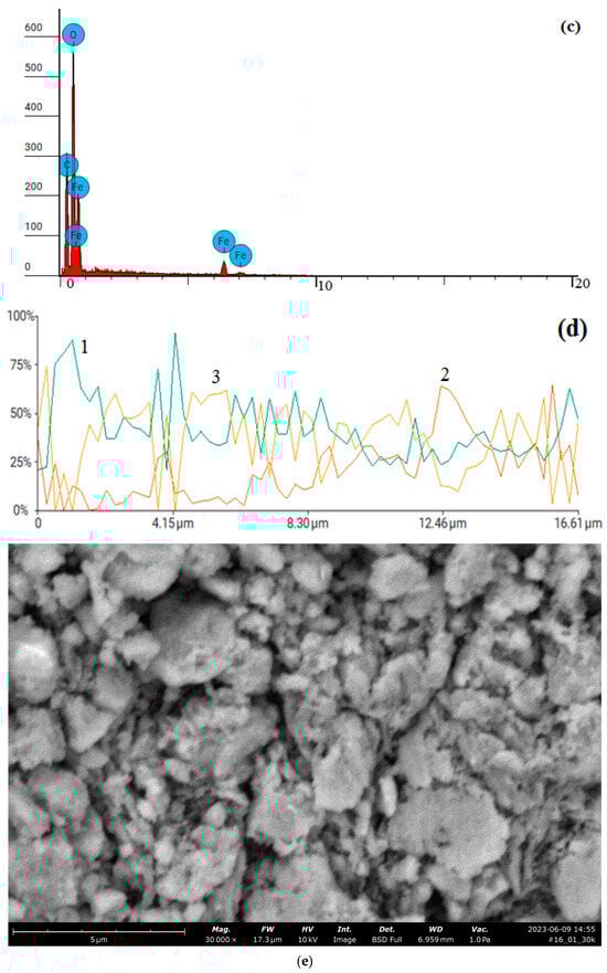 Data of analyses of a synthesized composite based on CoFe2O4 stabilized with PVP: SEM images: (a) magnification: ×10,000; (b) magnification: ×20,000; (c) X-ray fluorescence spectrum; (d) combined line scan—weight of elements: 1—oxygen, 2—carbon, 3—iron; (e) SEM image of CoFe2O4 composite stabilized with PVP for a CoFe2O4 stabilized with PVP; (f) X-ray fluorescence spectrum for CoFe2O4 stabilized with PVP.