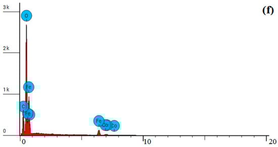 The element concentrations of CoFe2O4 composite stabilized with PVP in a spot scan on Figure 17e,f are presented in Table 4.