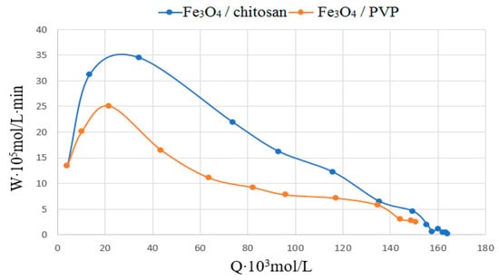 Catalysts with a composition of Fe3O4/chitosan and Fe3O4/PVP were also used for the oxidation of phenol with oxygen. Figure 18 shows typical conversion curves for the oxidation of phenol with oxygen, in the coordinates WO2 = f(QO2). W is oxygen absorption rate in mol/L × min; Q is amount of absorbed O2, mol/L. The initial rate of phenol oxidation on Fe3O4/chitosan was approximately one order of magnitude higher than on Fe3O4/PVP.