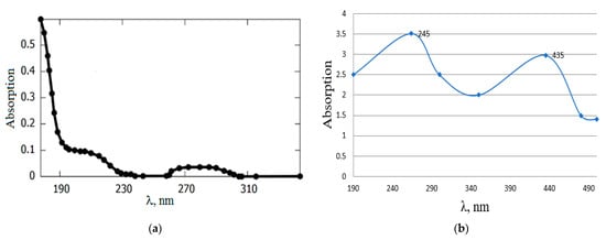 Figure 19 shows the absorption spectra of the original solution of phenol (0.01 mol/L). In the wavelength range 190–320 nm, there is an absorption band of phenol at 209 nm and 275 nm. By the decrease in optical density D at a given wavelength and the appearance of an absorption band at a wavelength of 240–245 nm, as well as a weak band at 435 nm, characteristic of benzoquinone, one can judge the decrease in the phenol content in the solution as a result of its oxidation to benzoquinone. Additional absorption bands that could correspond to possible intermediate products of phenol degradation, such as pyrocatechin, hydroquinone, and quinone, were not detected on the spectrum. This fact is confirmed by the IR spectrum data of the product. In the IR spectrum of the reaction product, absorption bands were observed in the region of 1630–1644 cm−1, indicating the presence of a C=O bond characteristic of p-benzoquinone.