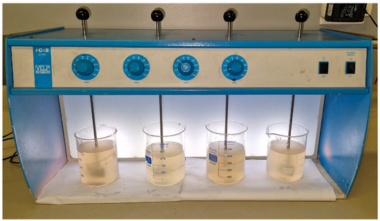 A typical jar test was conducted for chemical experiments. This method facilitates adjusting of pH as well as variations in coagulant and flocculant dosage to predict the effectiveness of a treatment plant operating on a larger scale. The experimental conditions related to coagulant and flocculant dosage have been described in a laboratory-scale study to treat winery wastewater [44]. Briefly, 4 400 mL samples of preconditioned wastewater were subjected to various dosages of coagulant and flocculant in order to determine optimum dosages to be used in the pilot plant study. The jar tests were conducted in a FC4S VELP Scientific jar test unit (South Africa) using 76 × 25 mm flat paddle impellers at room temperature (23 ± 1.0 °C), as shown in Figure 2.