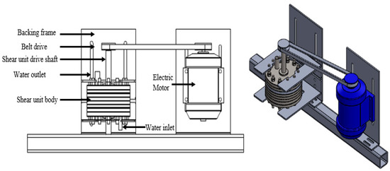 The shear unit was fabricated using steel sheets that were assembled to provide a sturdy external framework, accompanied by an internally rotating watertight unit, as illustrated in Figure 3. The multilayered steel structure facilitates the creation of an extended shear gap of 1.3 mm between the rotor and stator, allowing for the passage of wastewater through an entry and exit point. Rotational speed (in rpm) of the mixer was quantified using a high-precision tachometer, DT2236E (Addendorff, Cape Town, South Africa). The shear mixer presented in Figure 3 is currently part of a patent that has been filed and the exact details of the mixer will be presented in future work by the authors [45].
