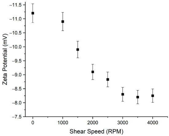 The effect of shear speed was investigated based on the zeta potential of the colloids, as illustrated in Figure 4. The adopted rotation speed of the shear mixer in this study was determined as 3250 rpm. This speed was based on optimal changes in surface charge of the particles determined using zeta potential analysis. Increasing the rotational speed of the shear mixer above 3250 rpm had no significant impact on further destabilizing the particles in solution.